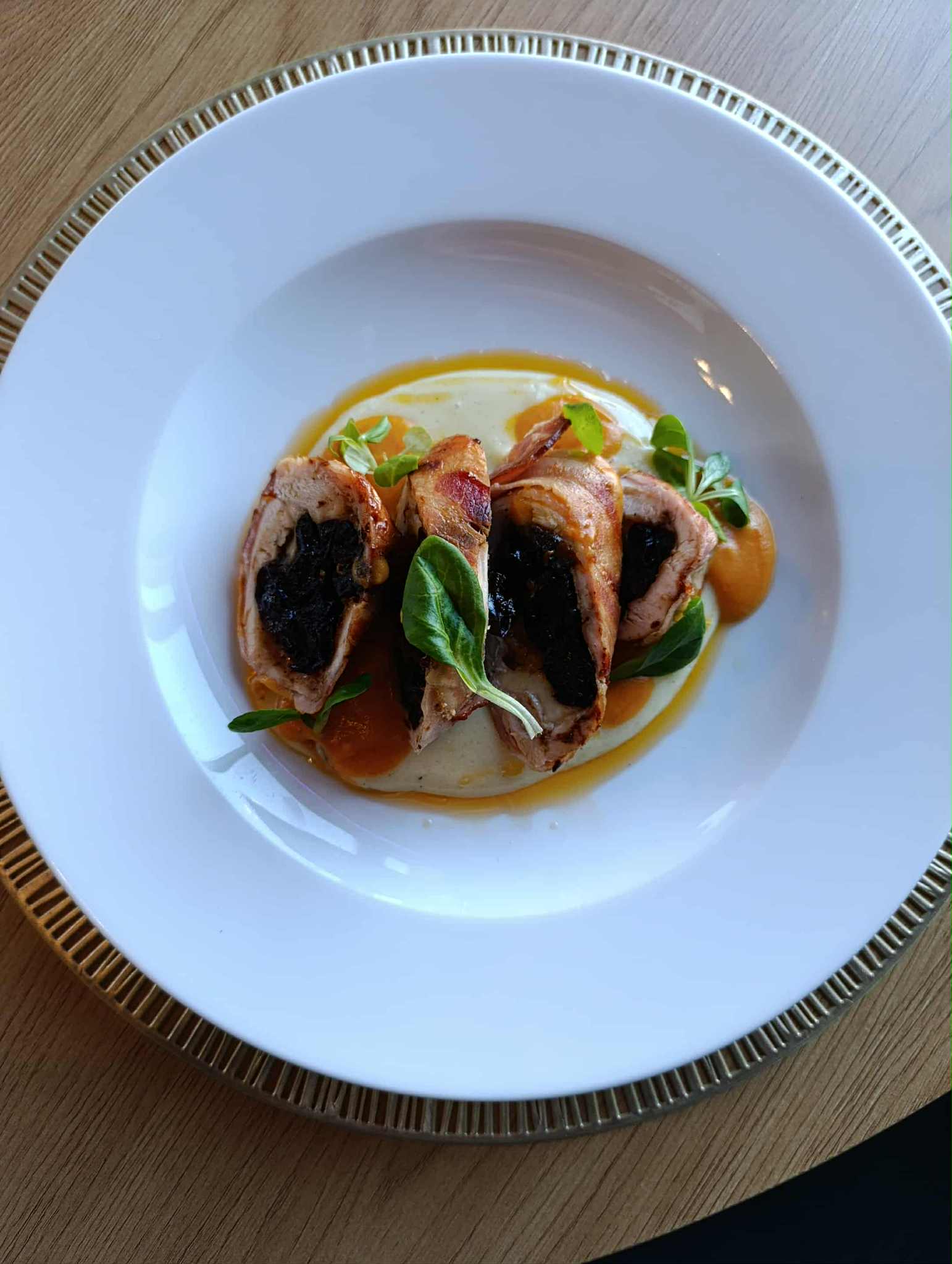Aszalt szilvával töltött,baconbe tekert csirke,pürével