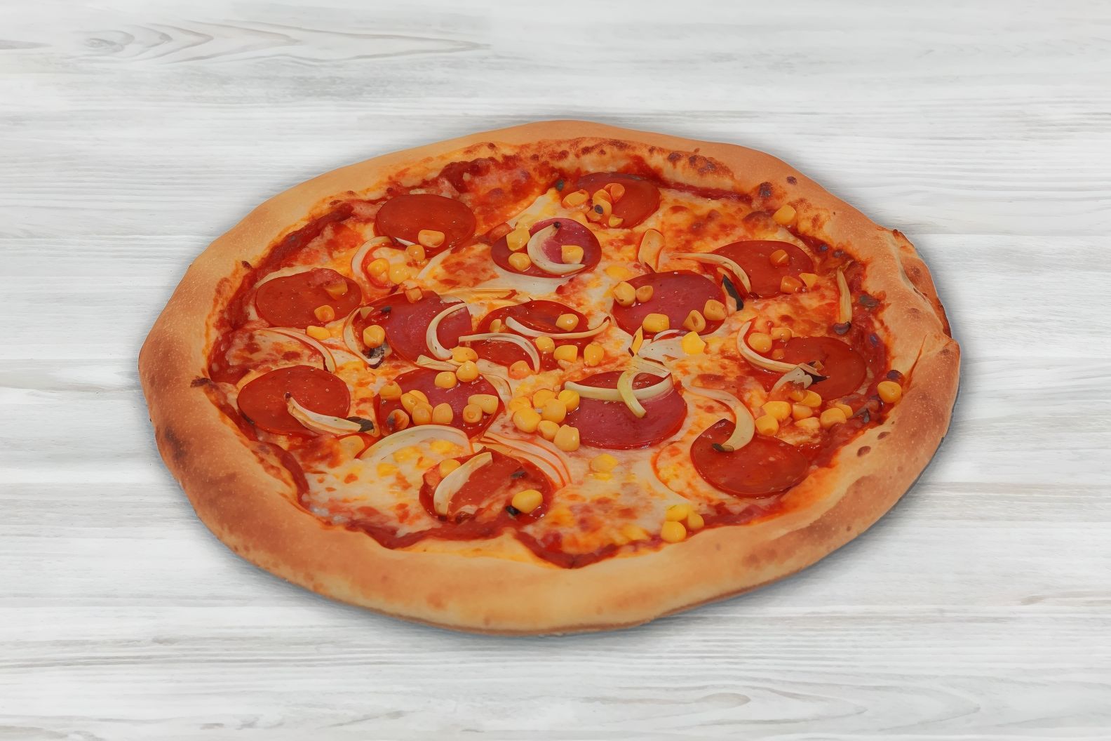 (pizzaszósz, kolbász, hagyma, kukorica, szalámi, mozzarella)