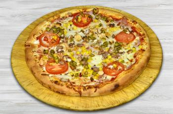 ((csípôs alap, sonka, kukorica, paprika, paradicsom, csirke, bab, csípõs pepperóni, hagyma, mozzarella)