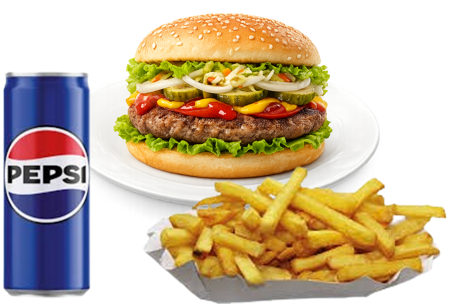 (Hamburger buci, házi készítésű húspogácsa, saláta, paradicsom, uborka, lila hagyma, ketchup, mustár, választható krumpli, üdítő)