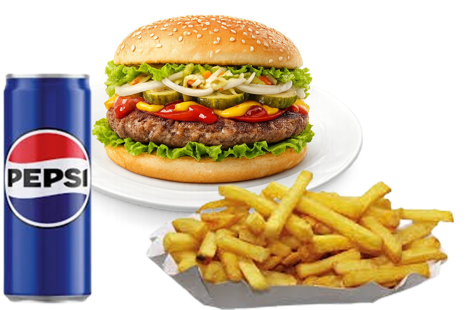 (Hamburger buci, házi készítésű húspogácsa, saláta, paradicsom, uborka, csalamádé, ketchup, mustár választható krumpli, üdítő)